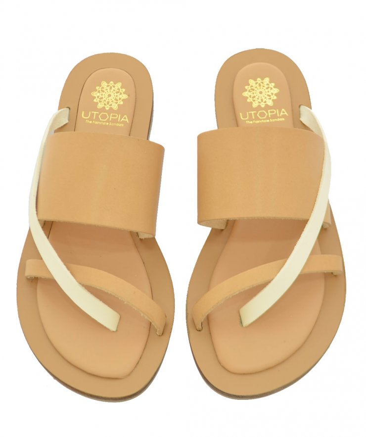 Classic flat & comfort leather sandals in natural and off white leather color.