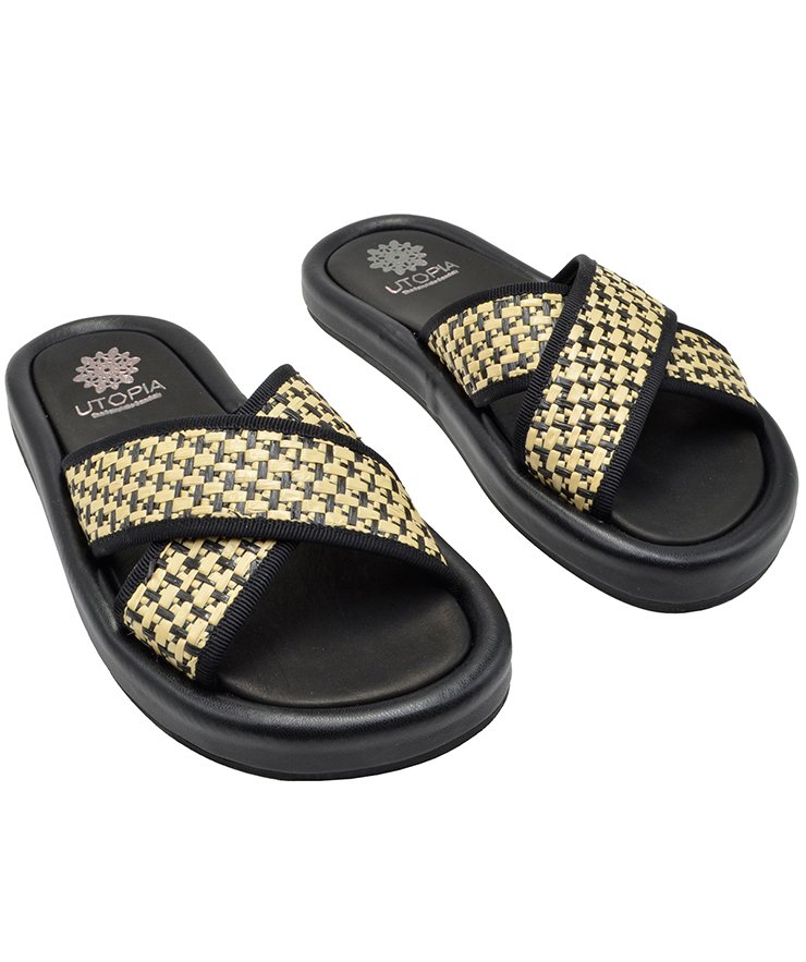Leather sandals in black raffia & leather color.