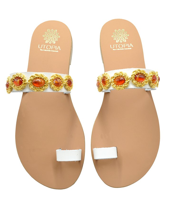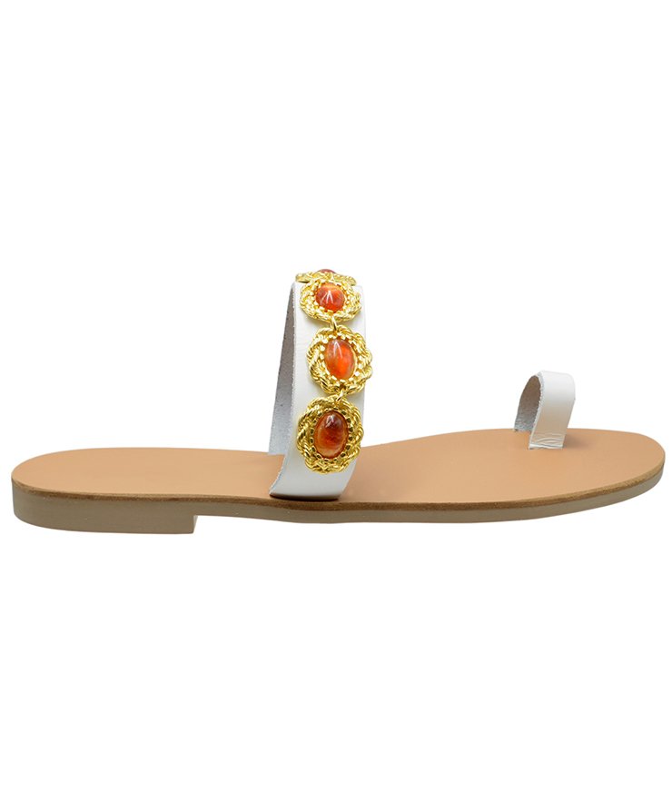Flat leather sandals in white color with gold accessories decorated by honey-beige beads.