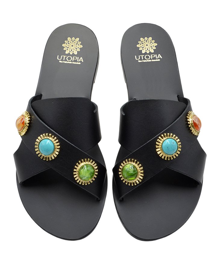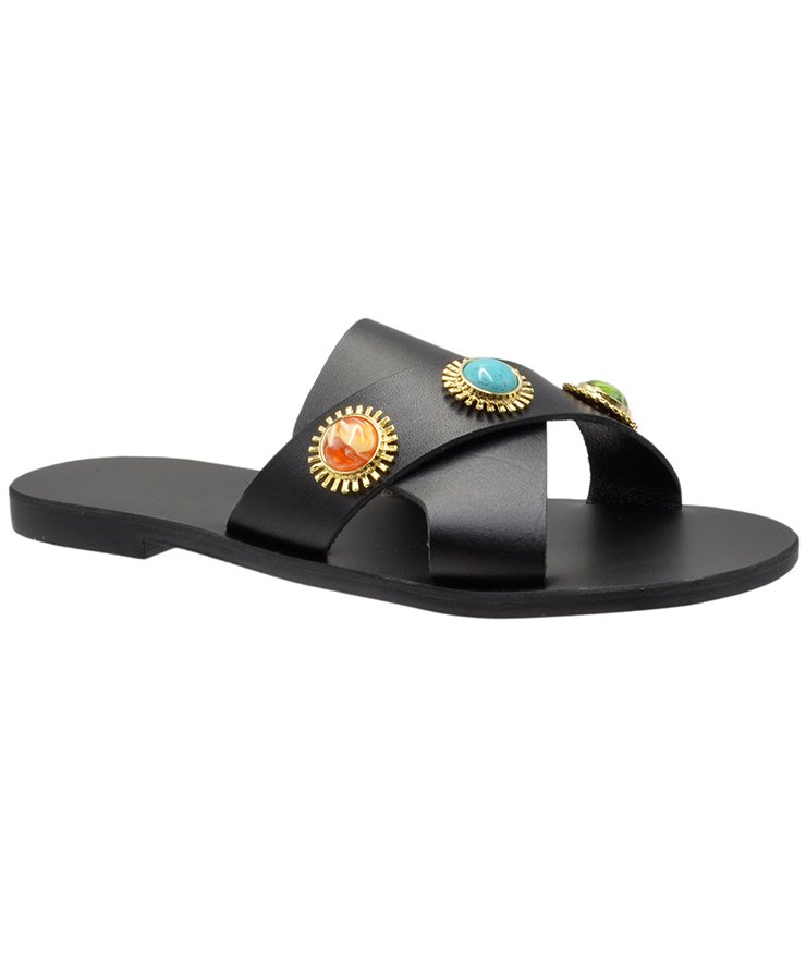 Classic flat leather sandals in black color with gold accessories decorated by honey-beige, light blue and green beads.