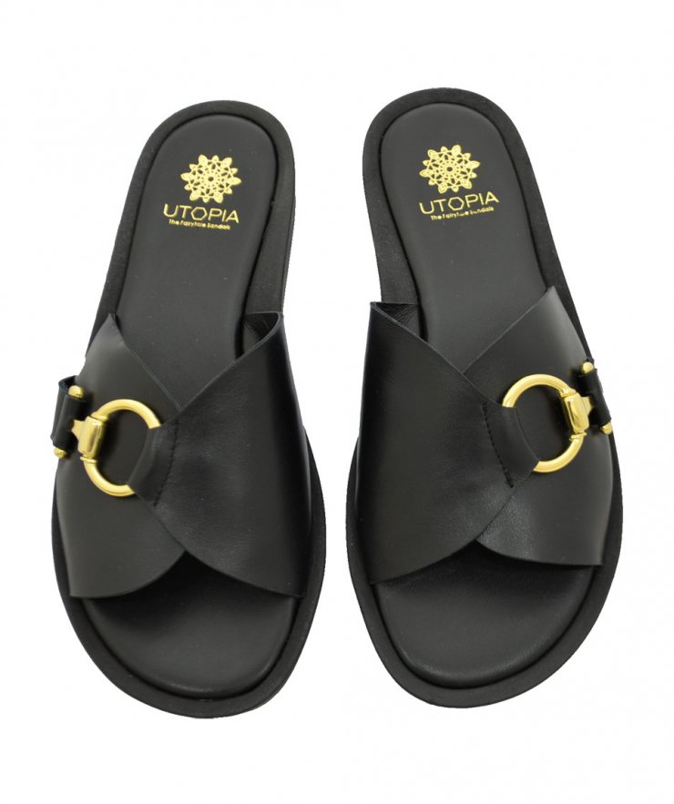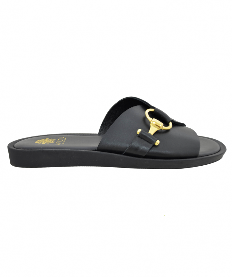 Leather sandals in black leather color decorated with gold metal accessories.