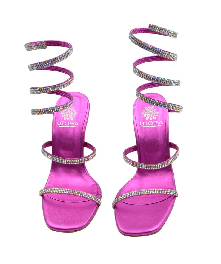 Leather high heeled sandals in fuchsia color, decorated with strass.