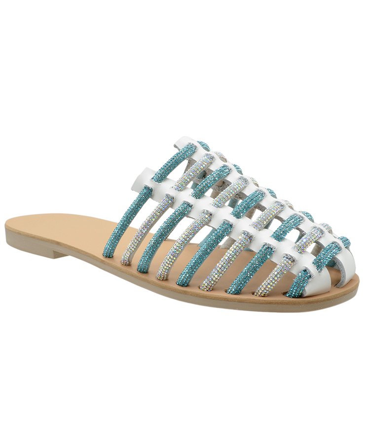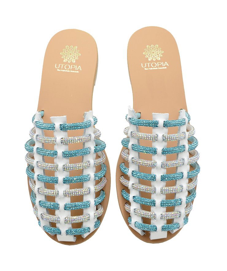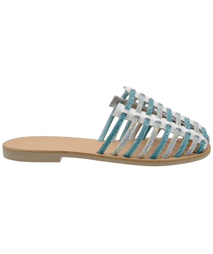 Flat leather sandals in white color decorated with ciel and iridescent strass.