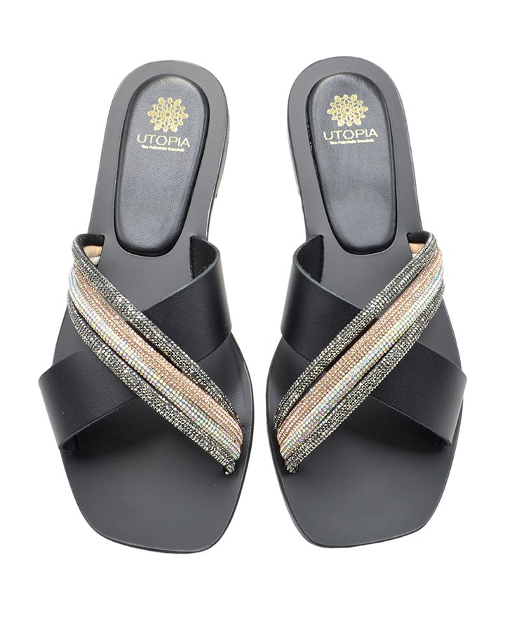 Flat sandals in black leather decorated with black,rose gold, and iridescent color strass.