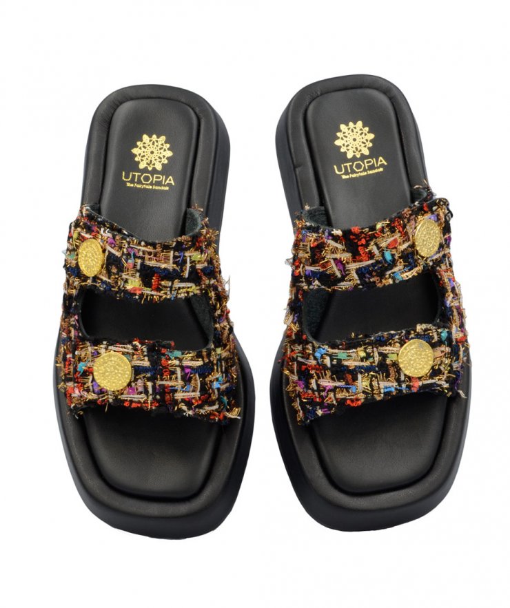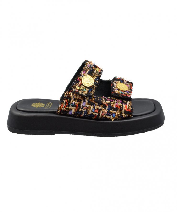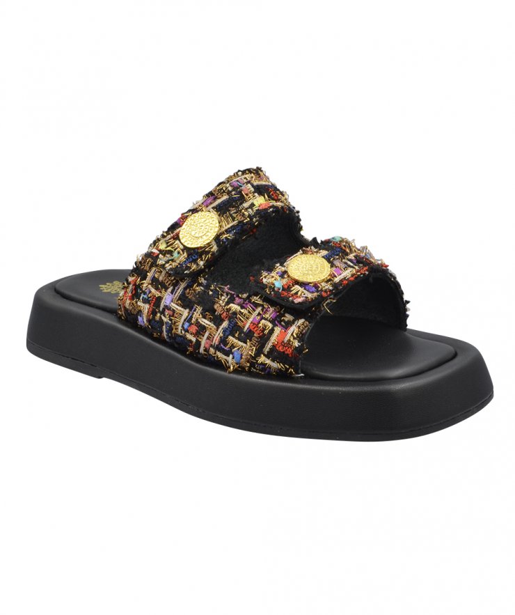 Leather sandals in black fabric color decorated with gold metal accessories.
