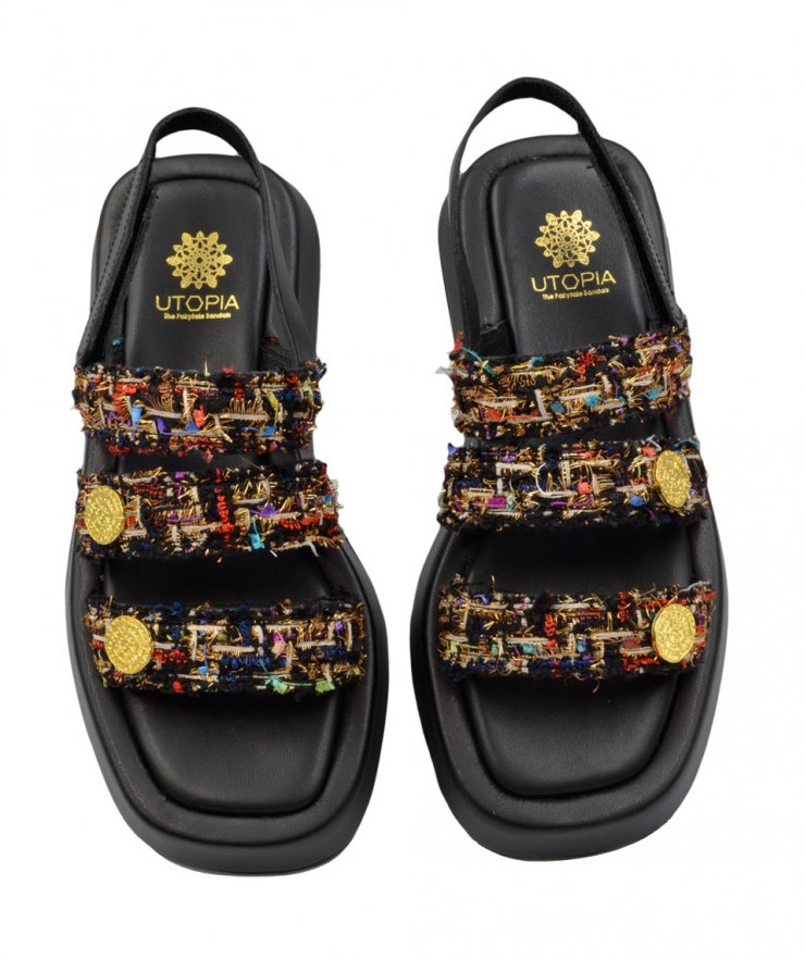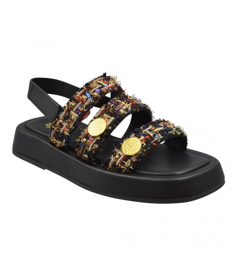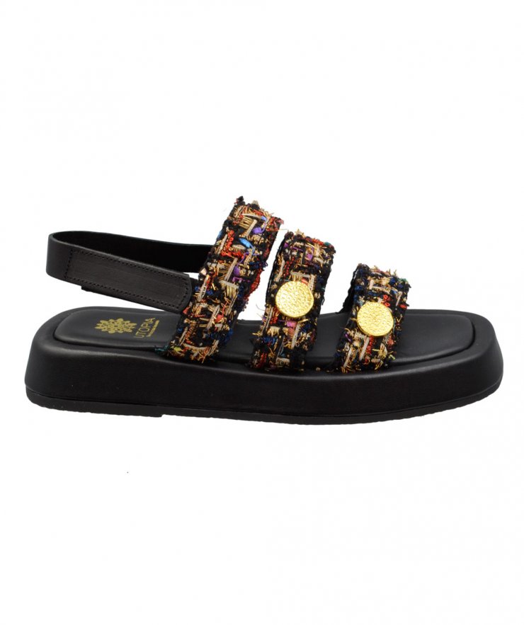 Leather sandals in black fabric color decorated with gold metal accessories.