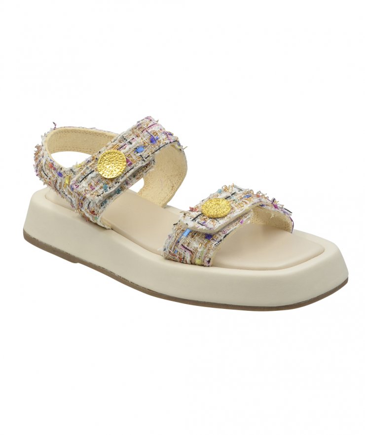 Leather sandals in white fabric color decorated with gold metal accessories.