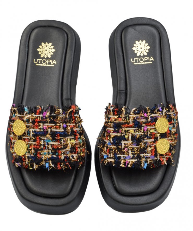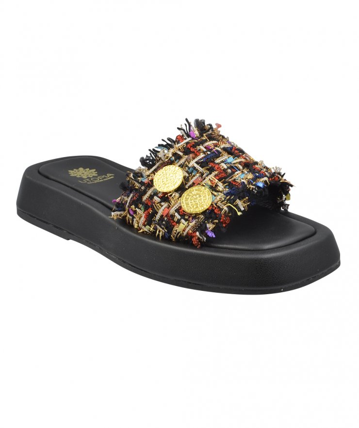 Leather sandals in black fabric color decorated with gold metal accessories.