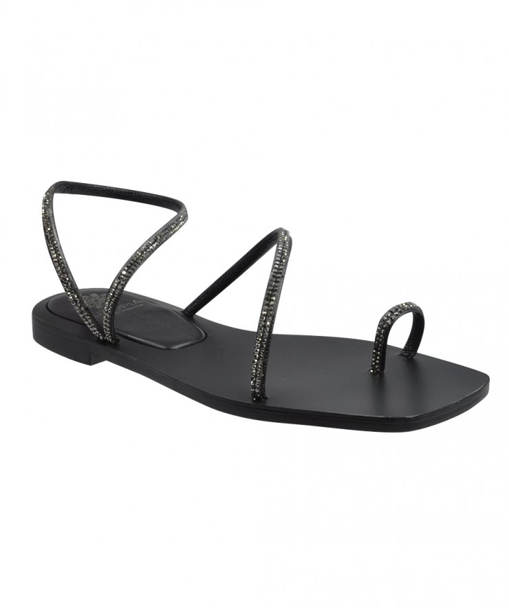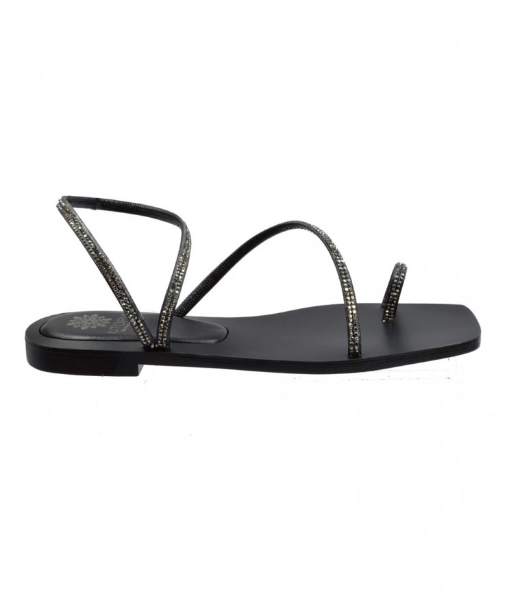 Flat leather sandals in black color decorated with strass.