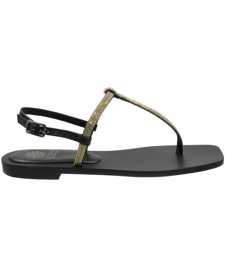 Flat leather sandals in black color decorated with strass.