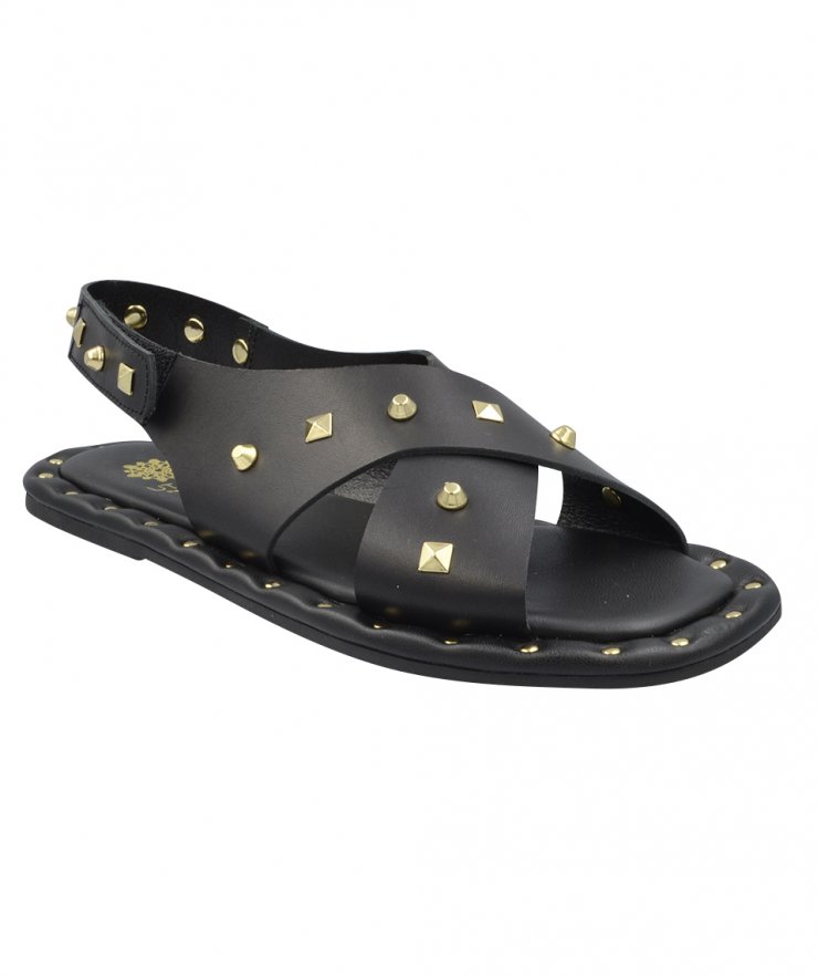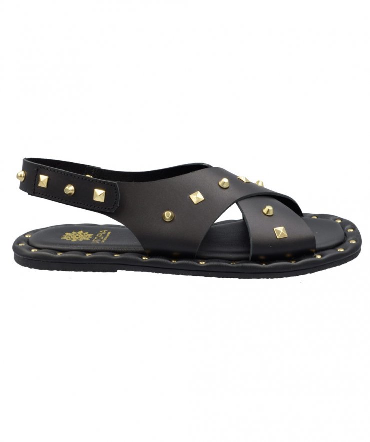 Flat squared studded leather sandals in black color decorated with gold metal accessories.