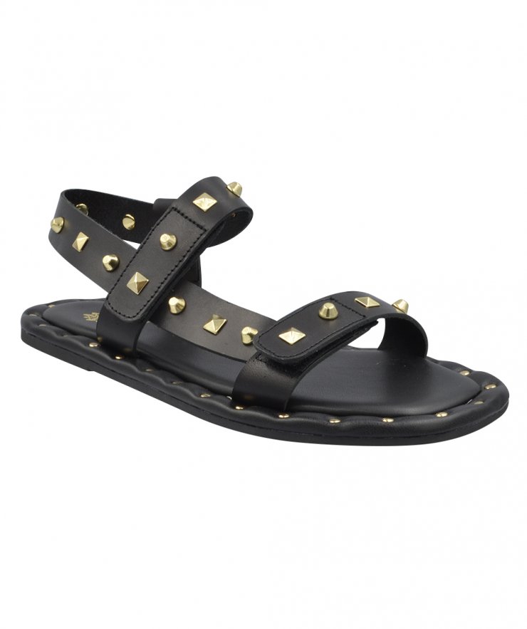 Flat squared studded leather sandals in black color decorated with gold metal accessories.